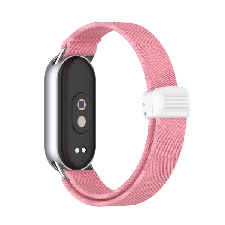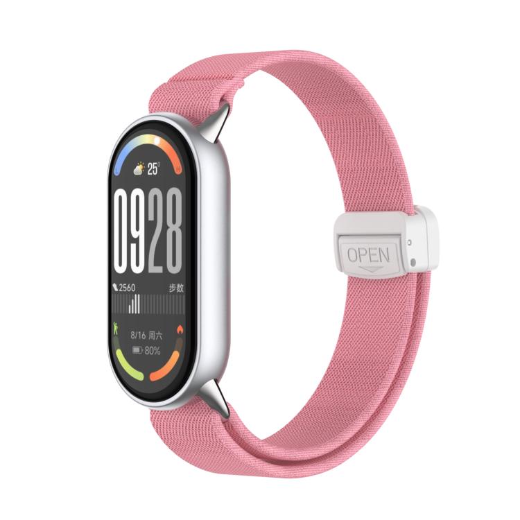 Correa de nailon elástica con hebilla magnética de plástico y cabeza de metal para Xiaomi Smart Band 10/9/8 (rosa brillante)