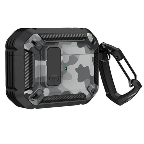 Estuche Para Auriculares Airpods Pro Impreso Dos Tonos Interruptor Bloqueo Mosquetón (Negro + Gris Camuflaje)