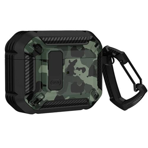 Estuche para Auriculares Airpods Pro Impreso Dos Tonos con Interruptor de Bloqueo y Mosquetón (Negro + Verde Camuflaje)