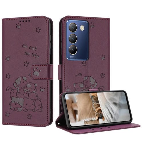 Funda de Piel con Estampado de Gatito y Cordón para Vivo Y100 Idn / Y200E 5G (Rojo Vino)