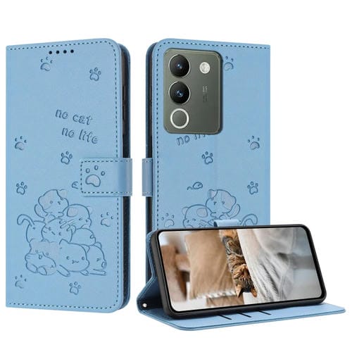 Funda de Cuero con Estampado de Gatito y Cordón para Vivo Y200 5G (Azul)