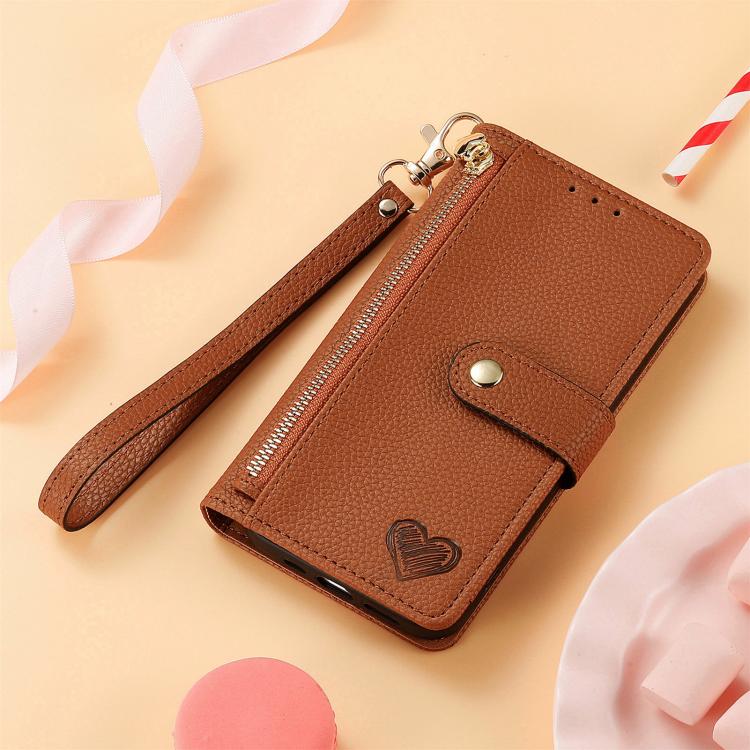 Funda de cuero con cordón y cremallera Love para iPhone 17 (marrón)
