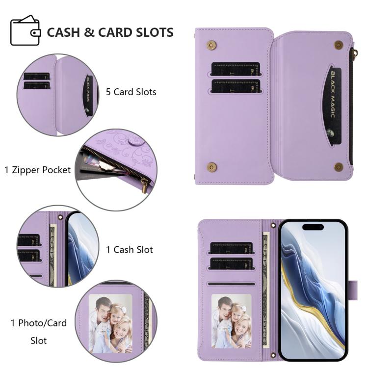 Funda de cuero con cremallera para iPhone 12/12 Pro, diseño de mariposas, flores y amor (morado claro)