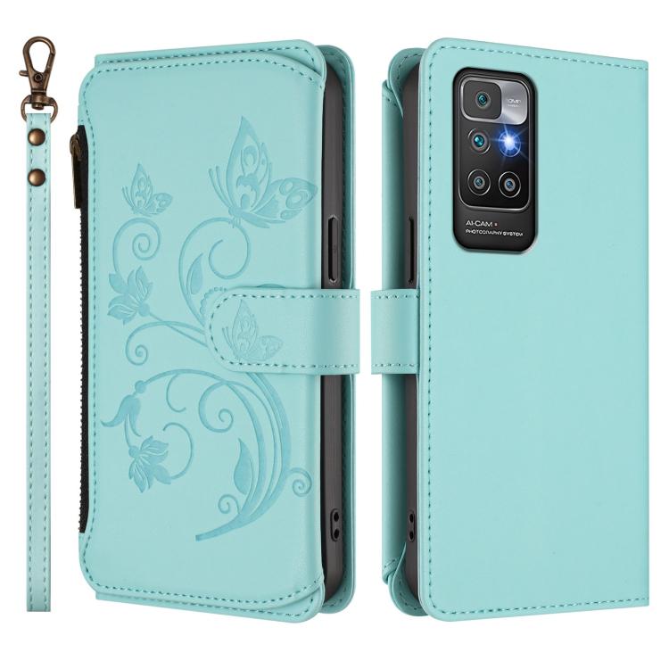 Funda de cuero con cremallera para Redmi 10 2022, diseño de mariposas, flores y mariposas (verde menta)
