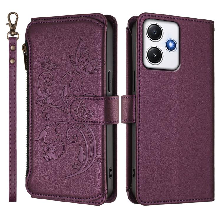 Funda de cuero con cremallera para Redmi 12 4G / 5G / Note 12R, diseño de mariposas, flores y múltiples tarjetas (morado oscuro)