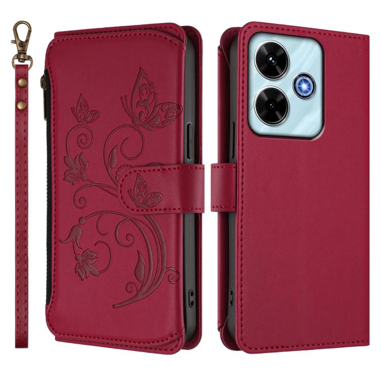 Funda de cuero con cremallera para Redmi 13 4G / 5G / 13x / Xiaomi Poco M6 4G, diseño de mariposas y flores, con múltiples tarjetas (rojo vino)