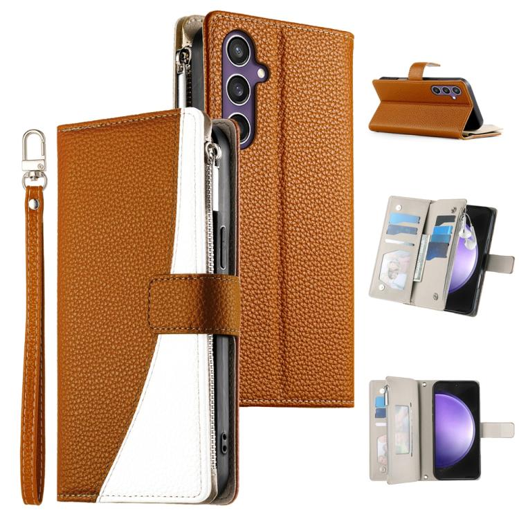 Funda de cuero con cremallera para Samsung Galaxy S23 FE 5G, con costuras, para múltiples tarjetas y correa corta (marrón)
