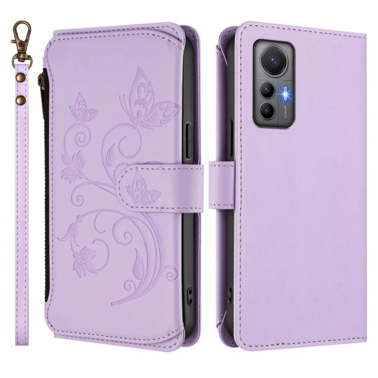 Funda de cuero con cremallera para Xiaomi 12 Lite, diseño de mariposas, flores y mariposas (morado claro)