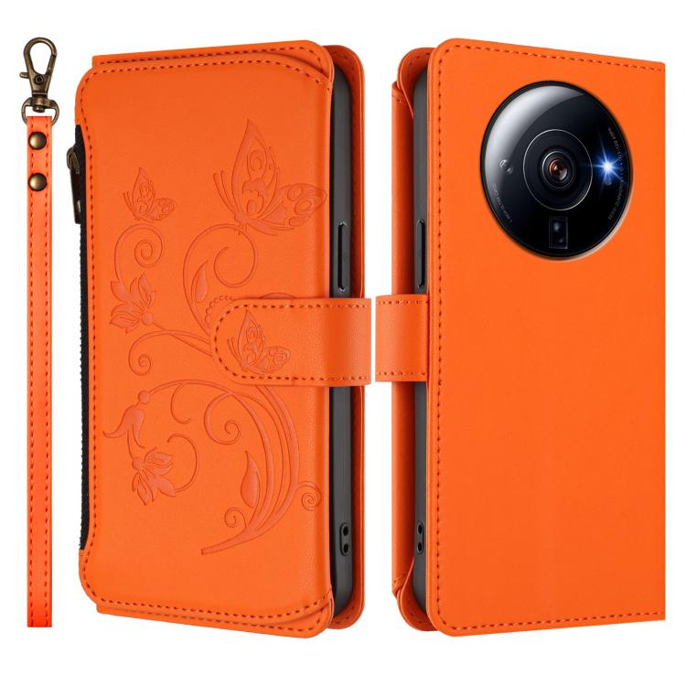 Funda de cuero con cremallera para Xiaomi 12S Ultra, diseño de mariposas, flores y amor, con múltiples tarjetas (naranja)