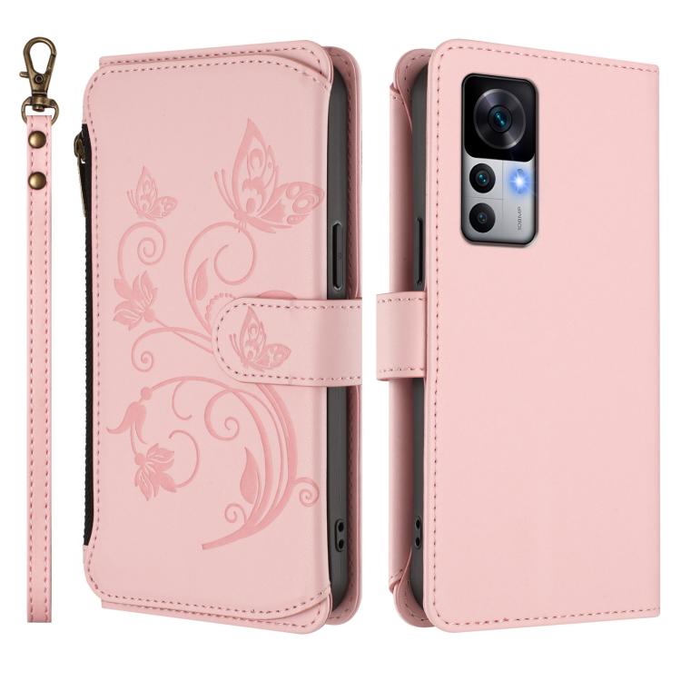 Funda de cuero con cremallera para Xiaomi 12T / 12T Pro / Redmi K50 Ultra, diseño de mariposas, flores y mariposas (rosa)