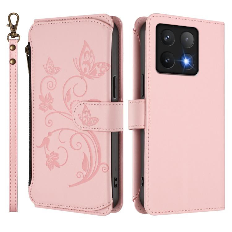 Funda de cuero con cremallera para Xiaomi 14T Pro, diseño de mariposas, flores y mariposas (rosa)