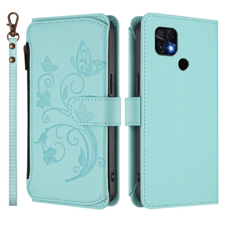 Funda de cuero con cremallera para Xiaomi Poco C40/Redmi 10C, diseño de mariposas y flores, con múltiples tarjetas (verde menta)