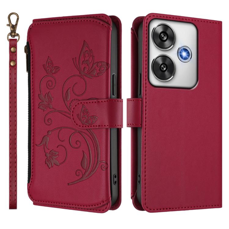 Funda de cuero con cremallera para Xiaomi Poco F6, diseño de mariposas, flores y mariposas (rojo vino)