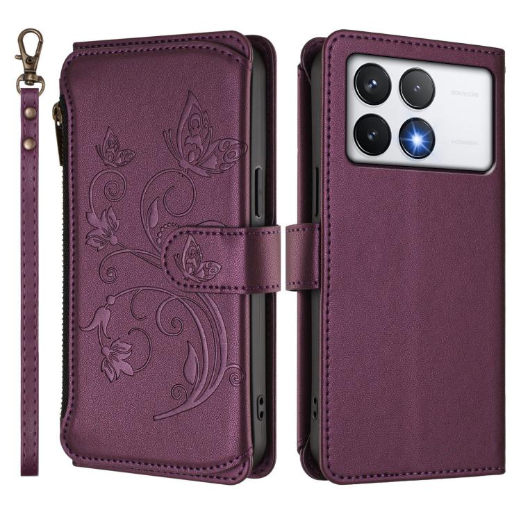 Funda de cuero con cremallera para Xiaomi Poco F6 Pro, diseño de mariposas, flores y mariposas (morado oscuro)