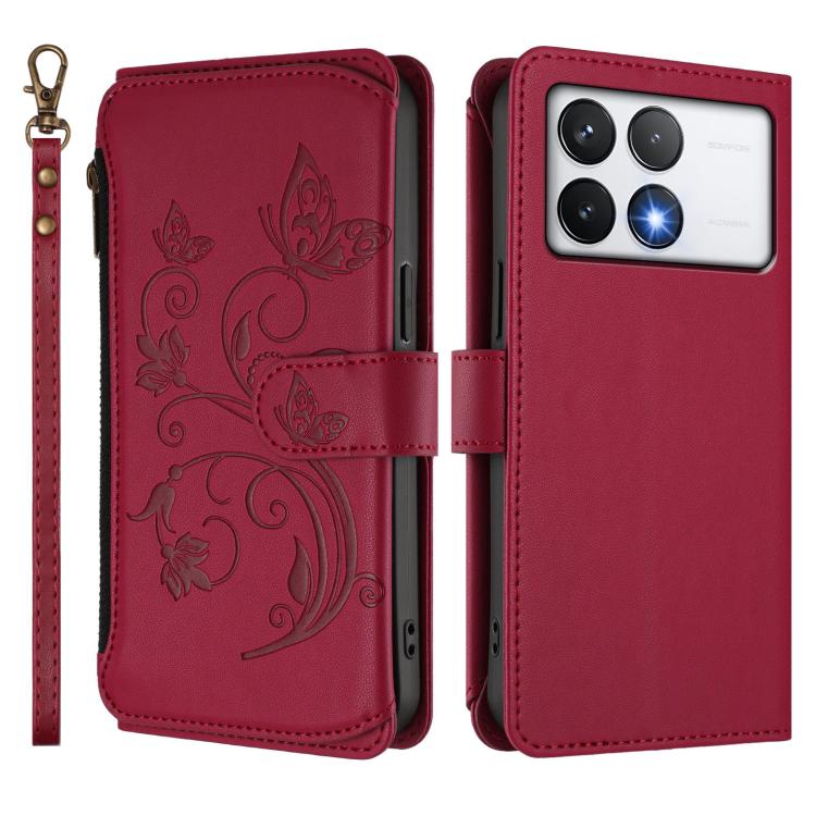 Funda de cuero con cremallera para Xiaomi Poco F6 Pro, diseño de mariposas, flores y mariposas (rojo vino)
