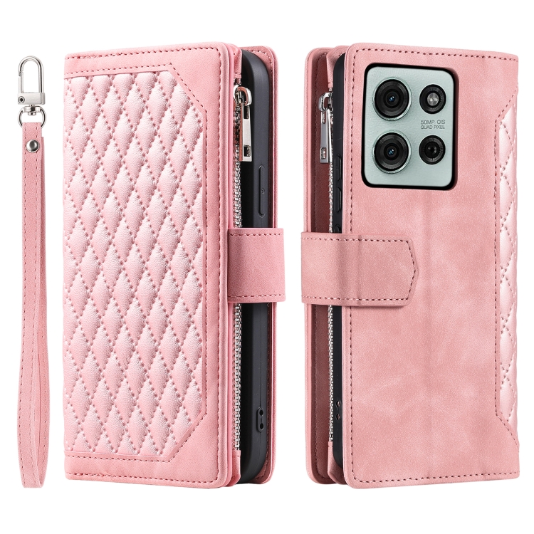 Funda de Cuero con Cremallera y Textura de Cuadrícula para Motorola Moto G75 5G con Cordón (Oro Rosa)