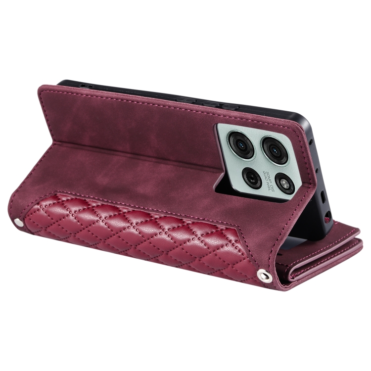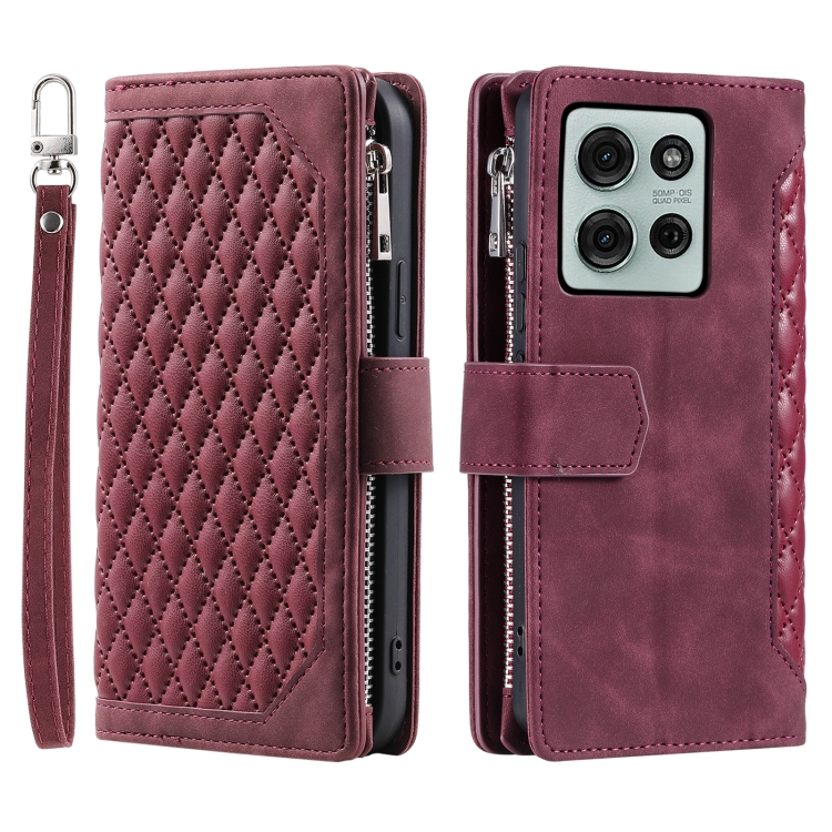 Funda de Cuero con Cremallera y Textura de Cuadrícula para Motorola Moto G75 5G con Cordón (Rojo Vino)