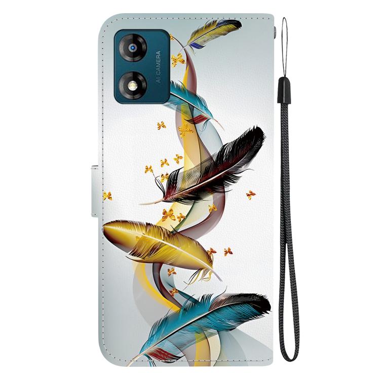 Funda de Cuero para Motorola Moto E13 con Dibujo de Colores y Textura de Cristal (Plumas de Mariposa Doradas)
