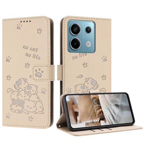 Funda de Cuero con Estampado de Gatito En Relieve para Redmi Note 13 5G con Cordón (Beige)