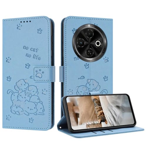 Funda de Cuero para Tecno Spark 30C con Diseño de Gatito en Relieve y Cordón (Azul)