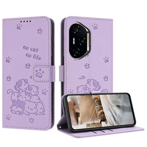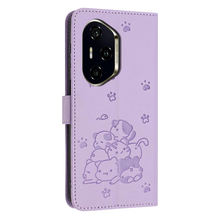 Funda de Cuero Honor 300 Pro con Diseño de Gatito En Relieve y Cordón (Morado)