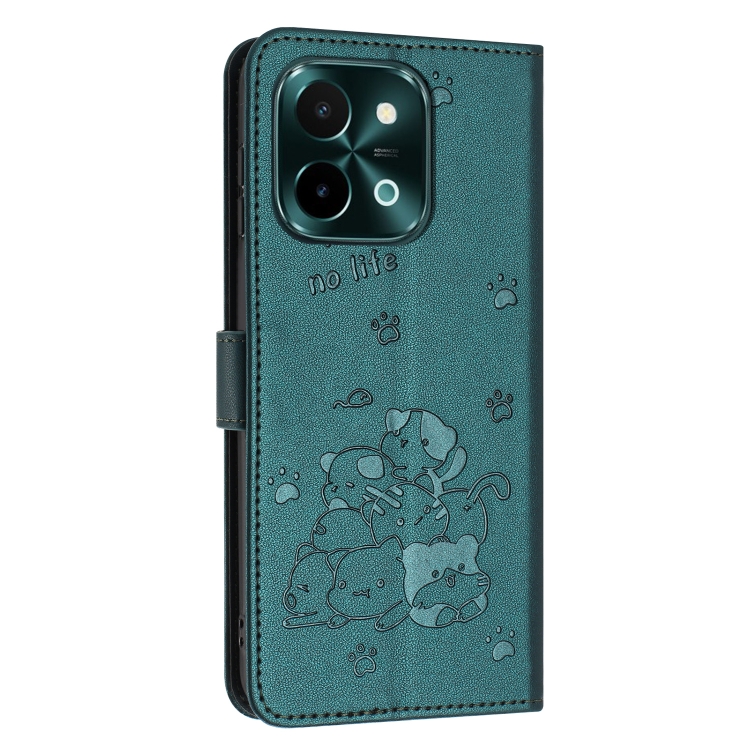 Funda de Piel con Diseño de Gatito En Relieve y Cordón para Vivo Y28 4G / Iqoo Z9X 5G (Verde Oscuro)