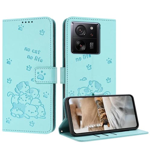 Funda de Piel con Diseño de Gatito En Relieve y Cordón para Xiaomi 13T/13T Pro (Verde Menta)