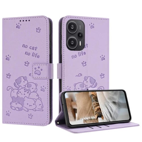 Funda de Piel con Diseño de Gatito En Relieve y Cordón para Xiaomi Poco F5 (Morado)