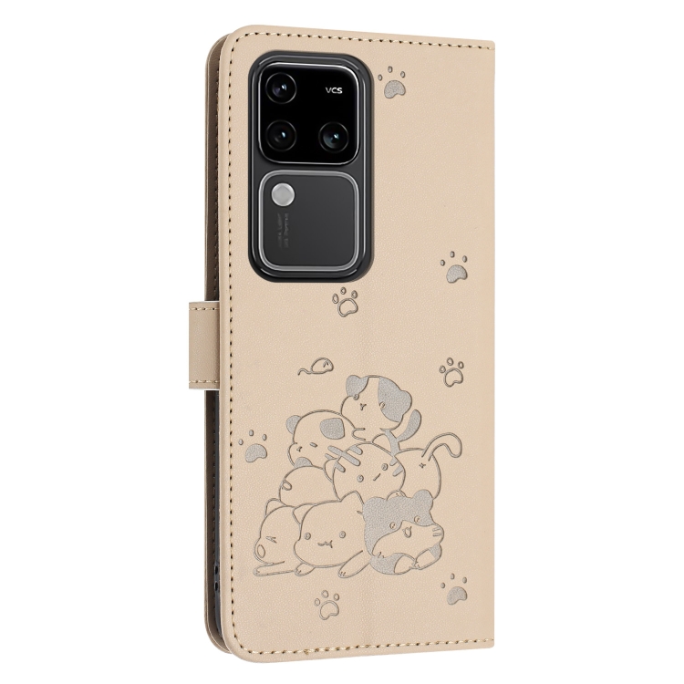 Funda de Piel con Diseño de Gatito En Relieve y Cordón para Vivo S18/S18 Pro (Beige)