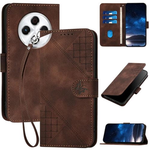 Funda de Cuero para Tecno Spark 30 4G con Diseño Mariposa En Relieve y Cordón (Café)