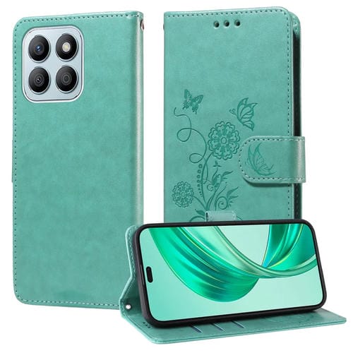Funda de Cuero para Honor X8B con Diseño de Mariposas y Flores en Relieve (Verde)
