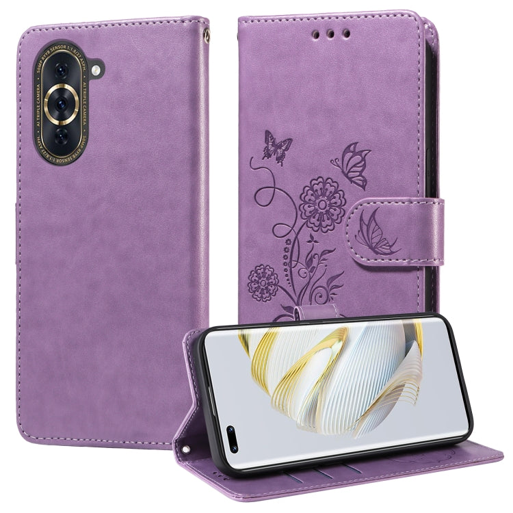 Funda de Cuero Huawei Nova 10 Pro con Diseño de Mariposas y Flores en Relieve (Morado)
