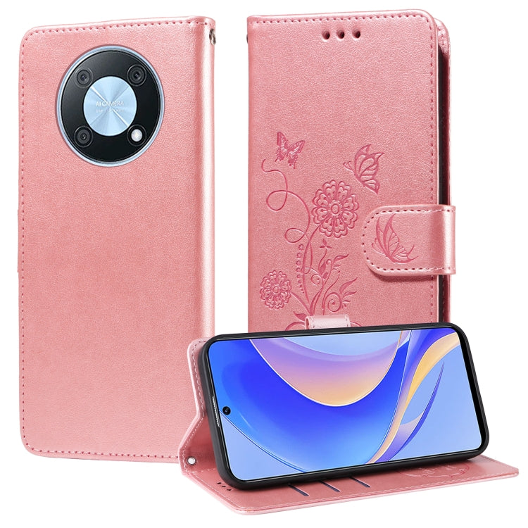 Funda de Cuero Huawei Nova Y90 con Diseño de Mariposas y Flores en Relieve (Oro Rosa)