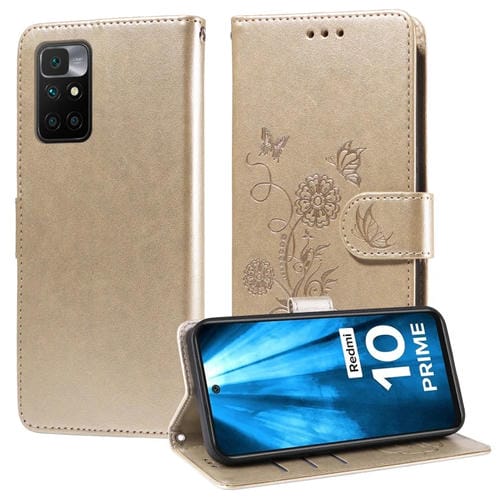 Funda de Cuero con Diseño de Mariposas y Flores En Relieve para Redmi 10 2022/10 Prime (Dorada)