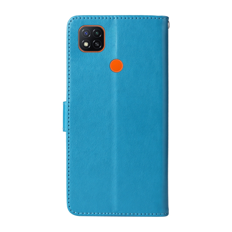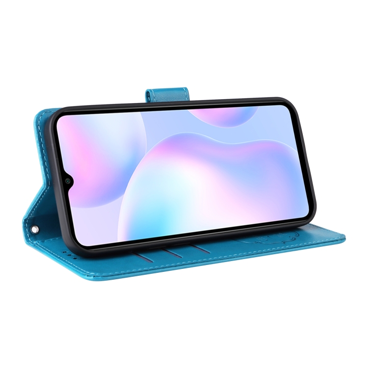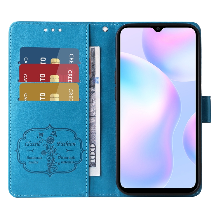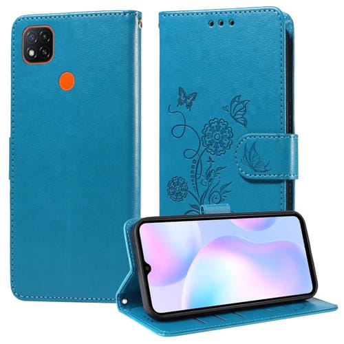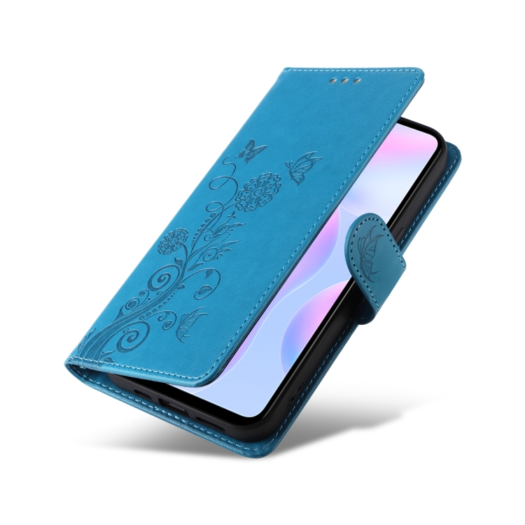 Funda de Cuero con Diseño de Mariposas y Flores En Relieve para Redmi 10A 4G (Azul)