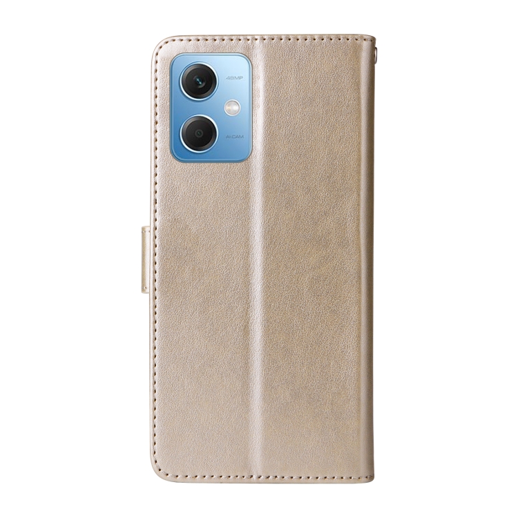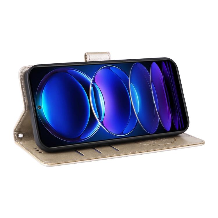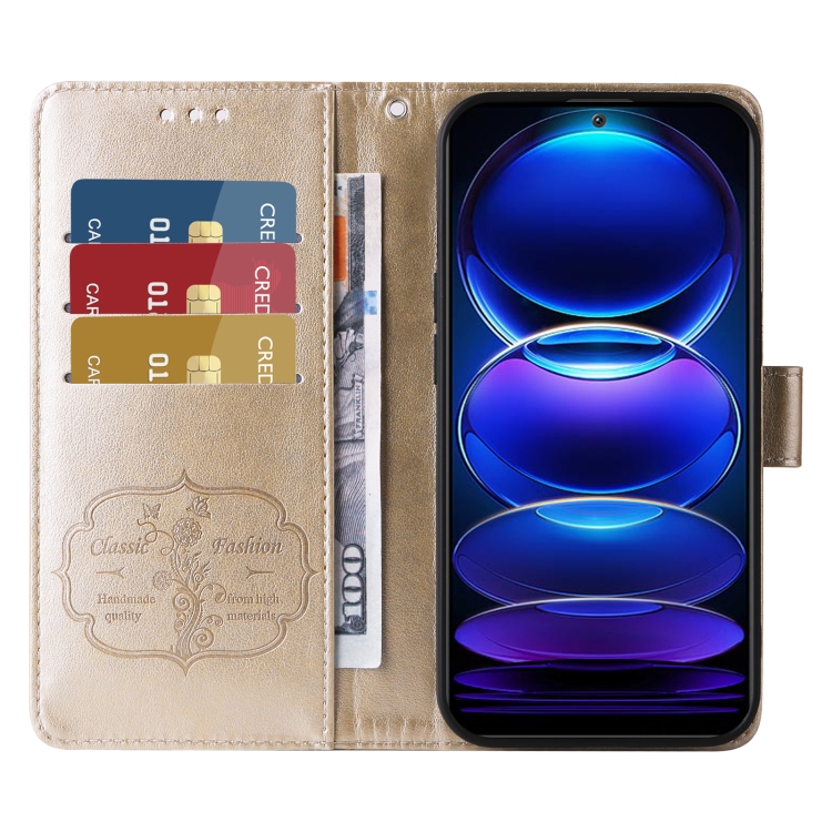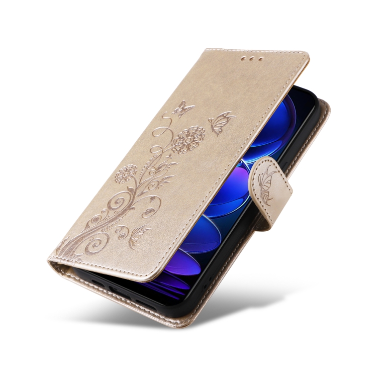 Funda de Cuero con Diseño de Mariposas y Flores En Relieve para Redmi Note 12 5G (Dorada)