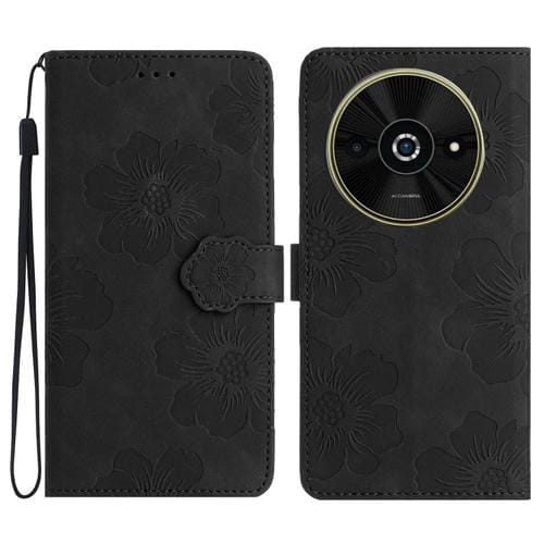 Funda de Cuero con Estampado de Flores En Relieve para Xiaomi Poco C61 (Negra)