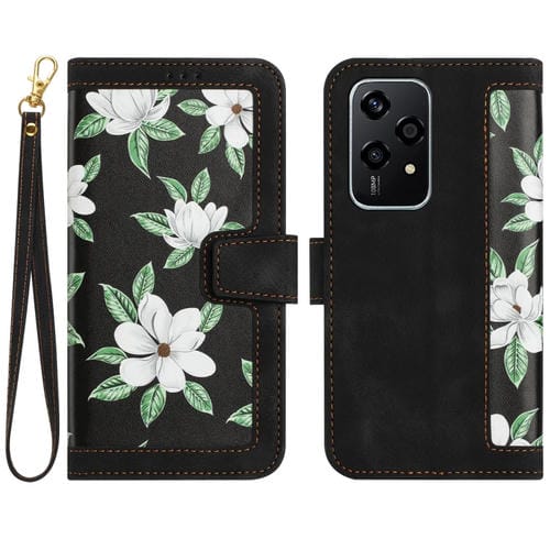 Funda de Cuero con Estampado Floral Global para Honor 200 Lite con Cordón (Negro)