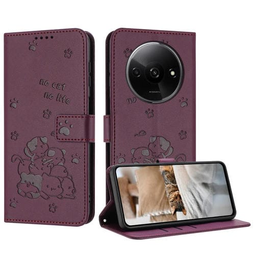 Funda de Piel con Diseño de Gatito En Relieve y Cordón para Redmi A3 4G Global / A3X 4G (Rojo Vino)