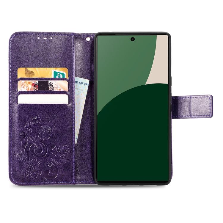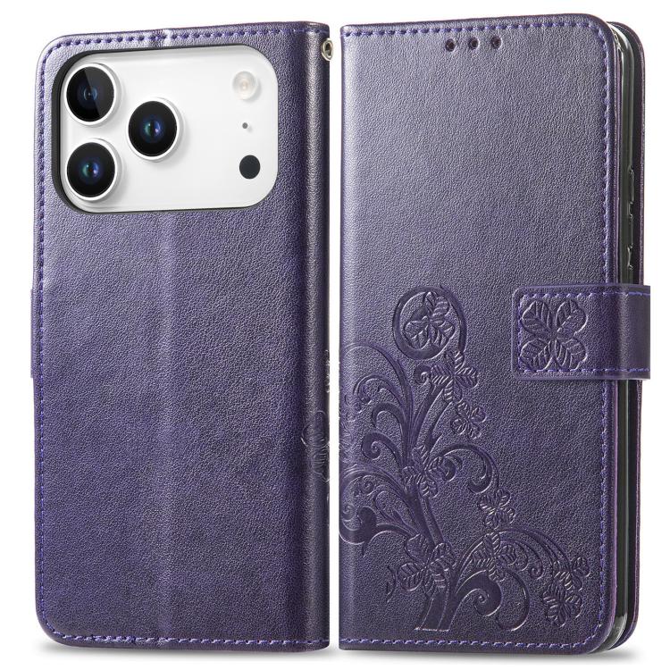 Funda de cuero con hebilla en relieve y cierre de cuatro hojas para iPhone 17 Pro (morado)