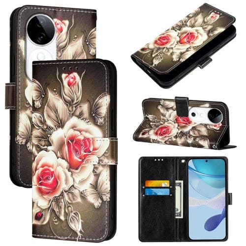 Funda de Cuero con Patrón de Dibujo En Color Liso para Teléfono Vivo S19 (Rosas Sobre Negro)