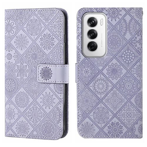 Funda de Cuero con Patrón En Relieve de Estilo Étnico Global para Oppo Reno12 5G (Morado)