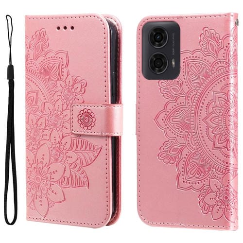 Funda de Cuero con Relieve de Flores de Siete Pétalos para Motorola Moto G04/G04S/G24/E14 (Oro Rosa)