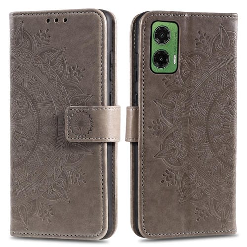 Funda de Cuero con Relieve de Flores para Motorola Moto G35 con Cordón (Gris)