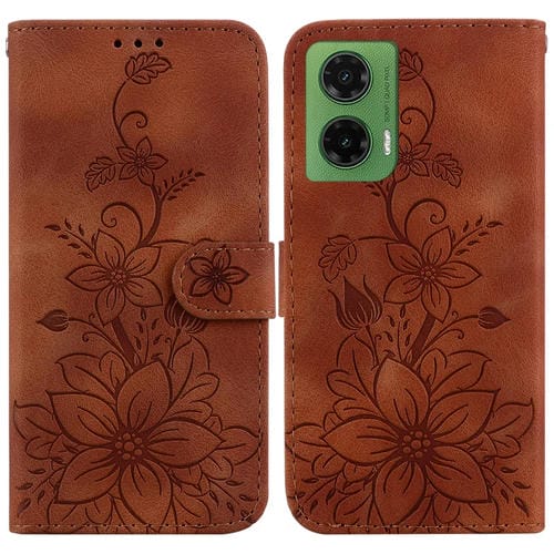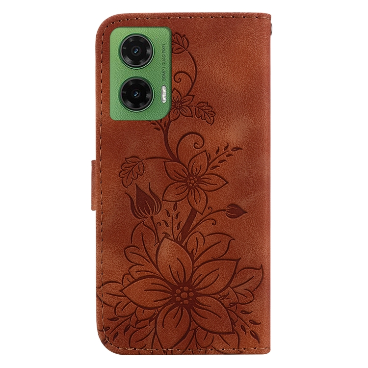 Funda de Cuero con Relieve de Lirios para Motorola Moto G35 (Marrón)
