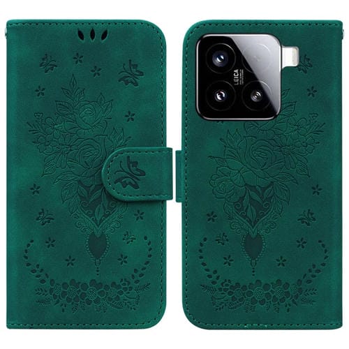 Funda De Cuero Con Relieve De Mariposa Y Rosa Para Xiaomi 15 (Verde)
