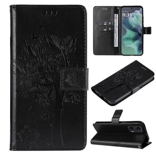 Funda de Cuero con Tapa para Motorola Moto G35 con Diseño Árbol y Gato en Relieve (Negro)