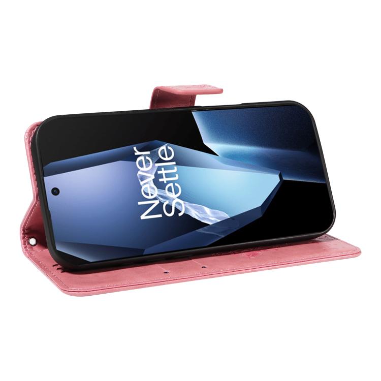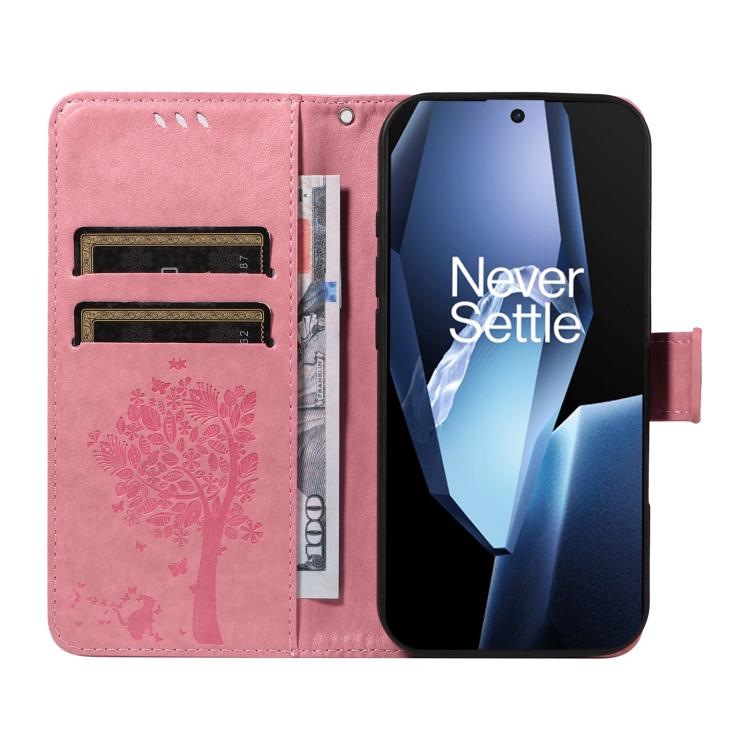 Funda de Cuero con Tapa para OnePlus 13R Global con Diseño de Árbol y Gato en Relieve (Rosa)