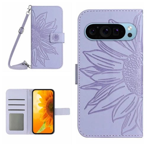 Funda de Cuero con Tapa y Cordón para Google Pixel 9 Pro XL con Diseño de Girasol (Morado)