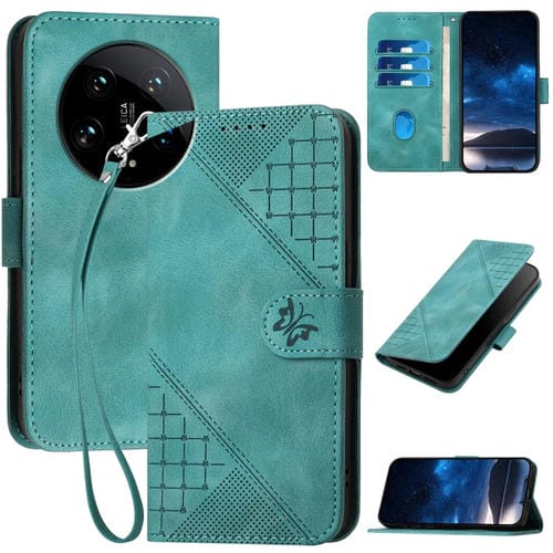 Funda De Cuero Con Tapa Y Cordón Para Xiaomi 14 Ultra Yx0080 Con Diseño De Mariposa En Relieve Y Cuadrícula (Azul Claro)